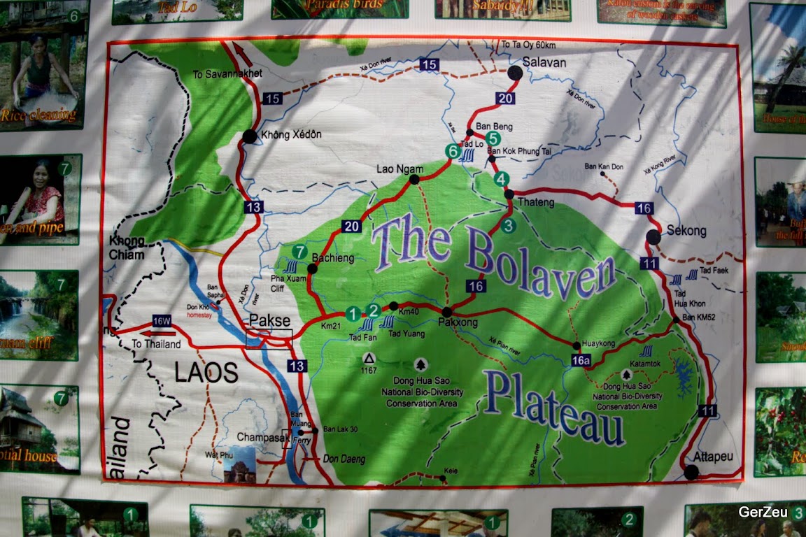 Straßenrestaurants aus dem sandigen Grund.Und erst von hier unten sieht man den Bolaven Plateau seine Höhe an.