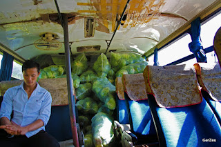 Die meisten "Fahrgäste" waren heute Säcke mit Kohlköpfen.Dass sich bei dem Bus auf der rasanten Abfahrt ein Bremssattel nicht mehr löste ist nach 5 Wochen Asien Buserfahrung fast schon normal. Stinkt und qualmt halt etwas. Die Lösung, ein paar Schläge mit dem immer griffbereiten Hammer. Und da es gerade auch nicht durchs Dach regnet bin ich rundherum zufrieden...