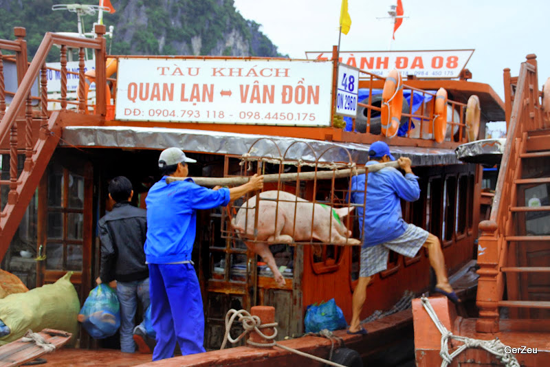 Das Ticket für 3,5h Fahrt kostet gerade mal 60.000 Dong, also nicht mal 2,40 Eur, dafür wurden auch gleich paar ausgewachsene Schweine mit auf das Boot gebracht, die ihren Unmut mit dauer-gequiecke kund taten, bis sie wohl die Seekrankheit zum Schweigen brachte.