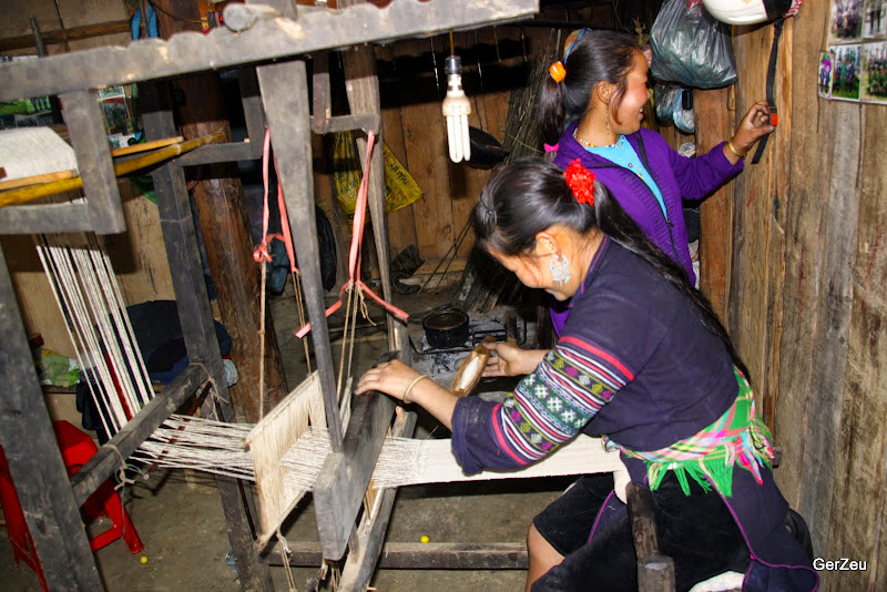 Neuer Tag, neuer Nebel. Irgendwann hatte ich den Weg in das ThanhPhu Tal gefunden. Ist neben dem Tal nach LaoCai der zweite Abstieg aus der Stadt.Erst Schlaglochpiste, dann Pfade zwischen den Reisterassen. Dazwischen immer wieder Hütten, vor denen auf Bambusstangen handgewebte und in Indigoblau oder Schwarz gefärbte Leinentücher hängen. Die Reisernte ist schon vorbei und so wird in den Terrassen z.T. Gemüse angebaut, oder die Büffel fressen die wieder austreiben den Reisstoppeln (und zertrampeln dabei die aufgeweichten Deiche. In fast jeder Hütte wird jetzt gesponnen und gewebt und die Männer brennen Schnaps.