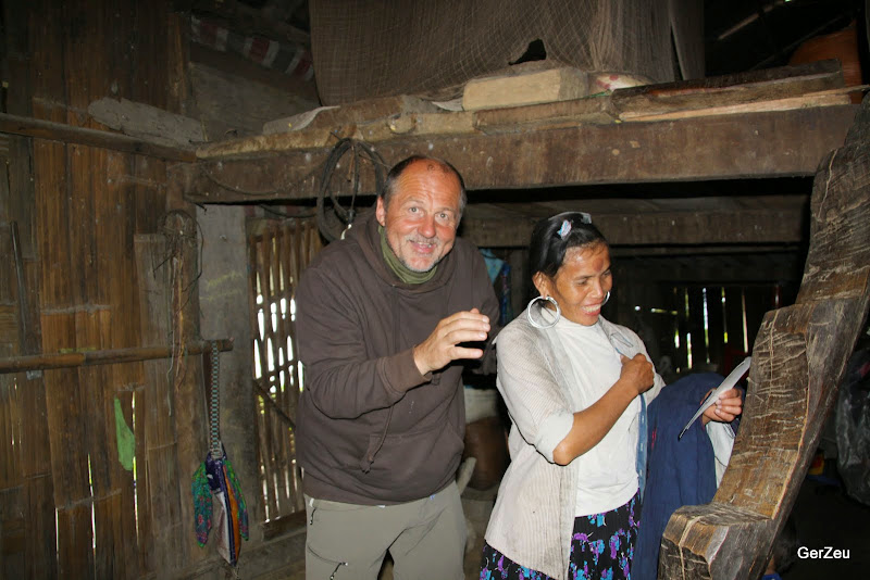 In einer kleinen Siedlung konnte ich viele Hmong ausmachen, also auf dahin. Letzte Nacht war ein Dorfmitglied gestorben und in seiner Hütte mühten sich 10 Leute den Mann sein Totengewand anzulegen. Danach ging die Totenfeier los. Die Frau des Toten klagte allein mit einen Lied vor der Hütte, das Dorf umringte den Leichnam und sang und klagte dort. Auf der Feuerstelle in der Hütte wurden Sachen des Toten verbrannt. Ziemlich aufgewühlt und selbst mit Tränen in den Augen zog ich mich wieder aus der Siedlung zurück.