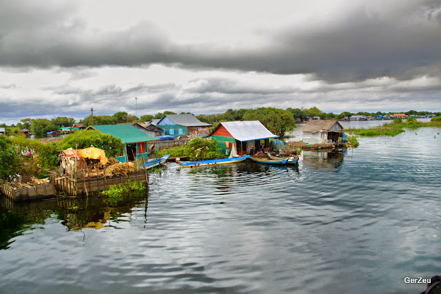 Die ersten paar Km gehen an einem der schwimmend Dörfer des Tonle