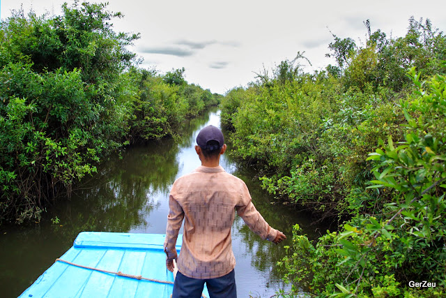 Tonle mündet, ist zwischen den endlosen Schlingpflanzenfeldern kaum etwas vom Fluss zu erkennen und selbst der Käp'ten hat erst im zweiten Anlauf den Ausgang /Eingang gefunden.